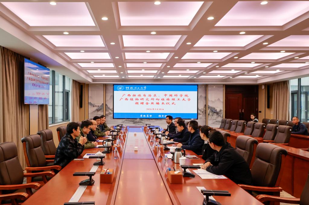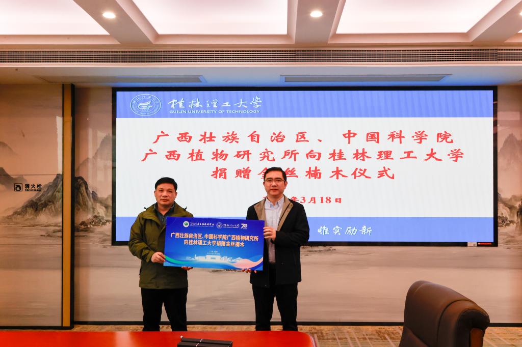 3月18日,广西壮族自治区、中国科学院广西植物研究所向我校捐赠金丝楠木仪式在雁山校区行知楼A406会议室举行。学校党委常委、副校长曾繁荣、广西植物研究所党委书记黄仕训出席捐赠仪式。