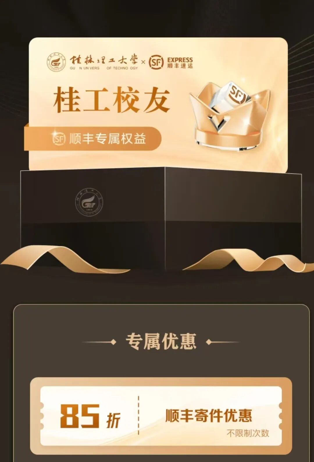 70周年校庆即将到来,学校为每一位桂工校友准备了华住金卡会员、呈旅黑金会员、顺丰寄件不限次85折等校友专属福利。